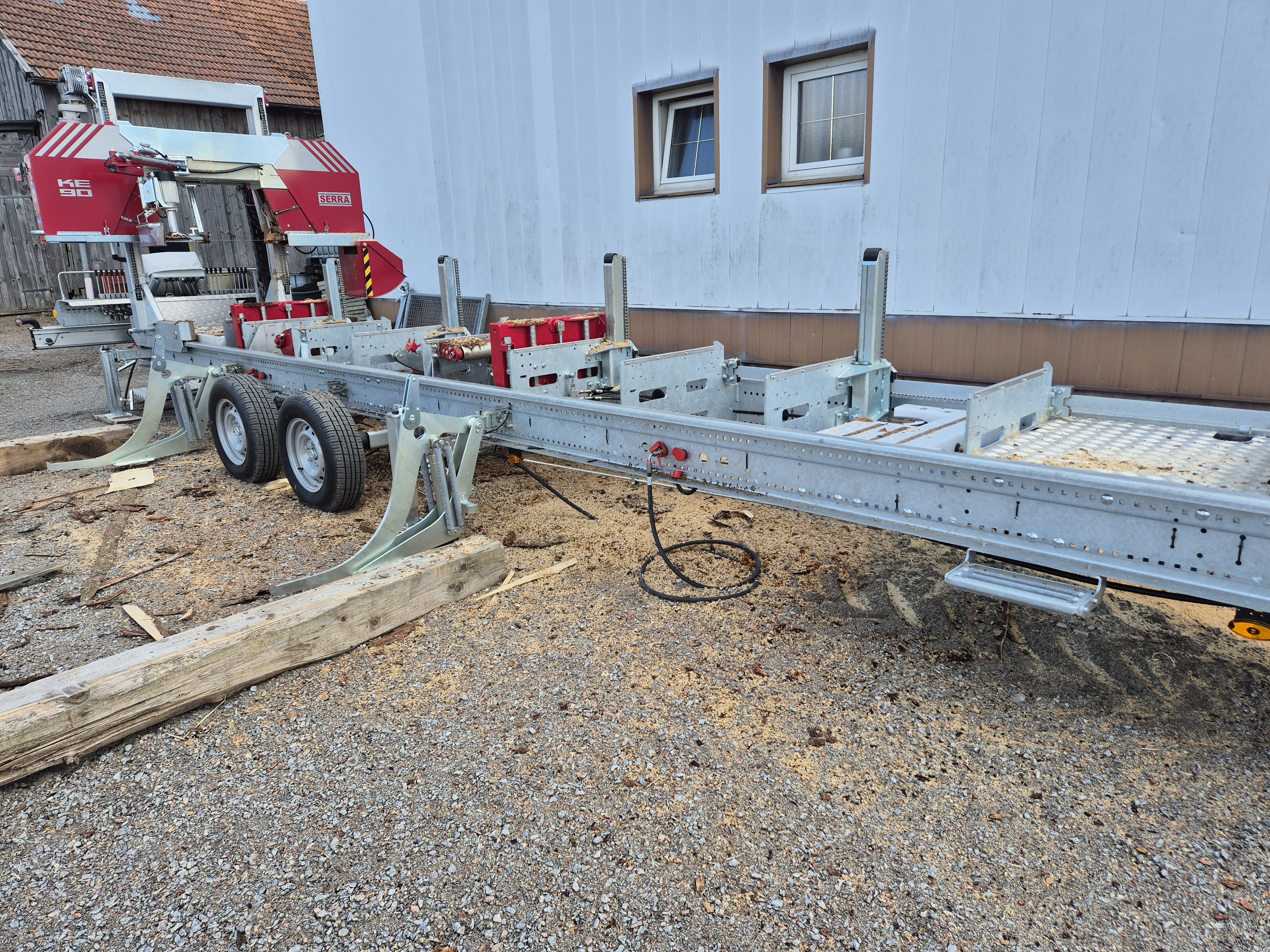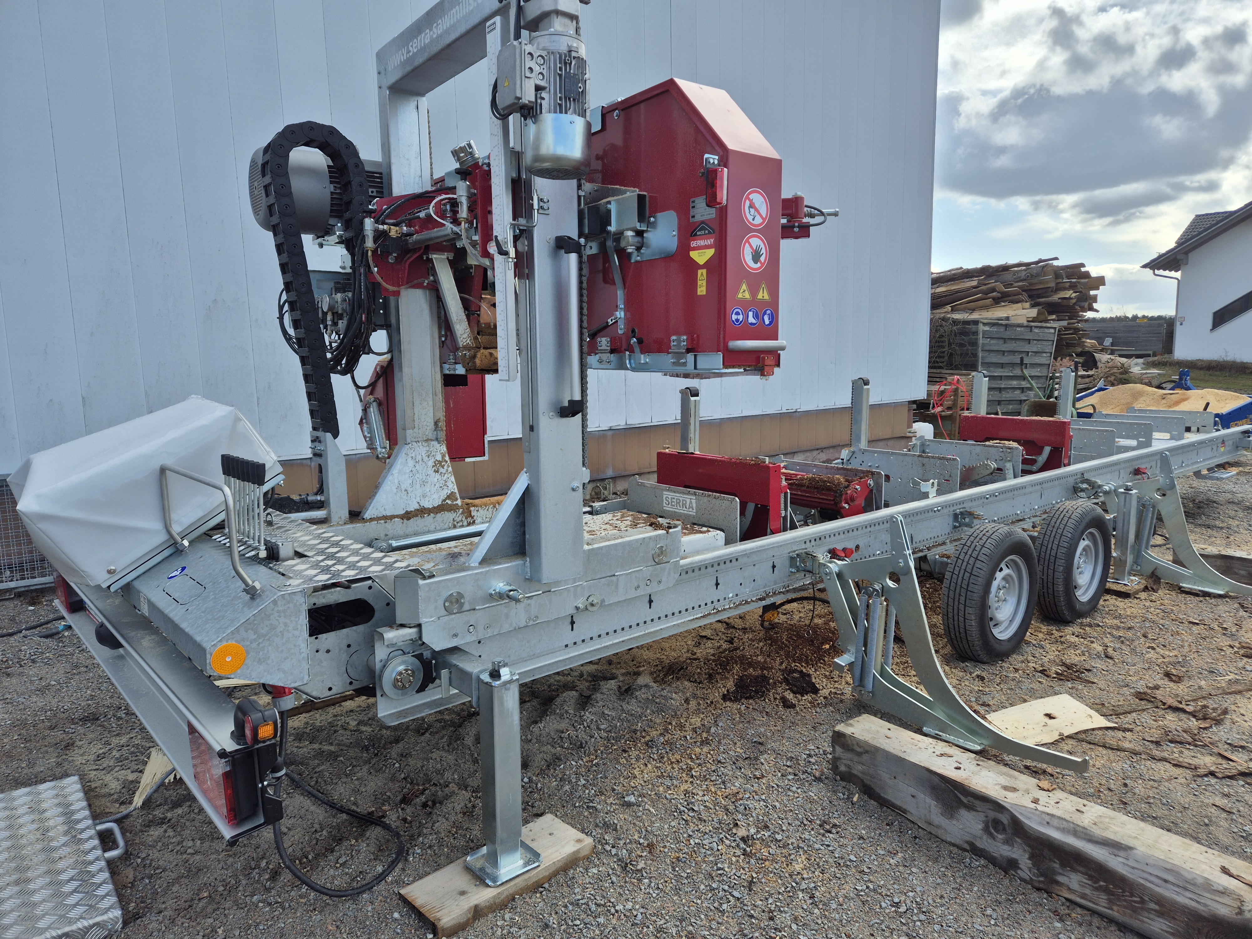 Benötigt wird ein Starkstromanschluss 32A und 2 Helfer zum Abnehmen des geschnittenen Holzes. Ebenso ist ein Fahrzeug mit Pallettengabel eine erhebliche Erleichterung.